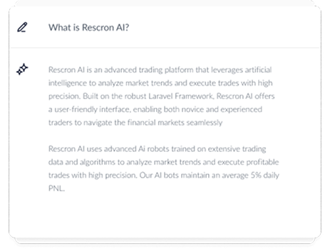 At Rescron AI, integrity and transparency are non-negotiable values. We prioritize your security and satisfaction above all else. We've created a secure and user-friendly trading environment where you can confidently pursue your financial goals.